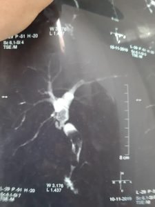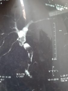 هذه صور رنين مغناطيسى علي القنوات المرارية لحالة تم لها إجراء عملية استئصال المرارة بالجراحة منذ ٢٠ سنة في مستشفى آخر وقد حدث اصابة جزئية في جدار القناة المرارية وقد وضع الجراح المعالج للحالة في ذلك الوقت أثناء العملية قسطرة في القناة المرارية لتصريف السائل المراري وقد حدث ضيق شديد في القناة المرارية مع تكوين حصوات في القناةالمرارية وصفراء انسدادية بعد ٢٠ سنة من إجراء إستئصال المرارة .
