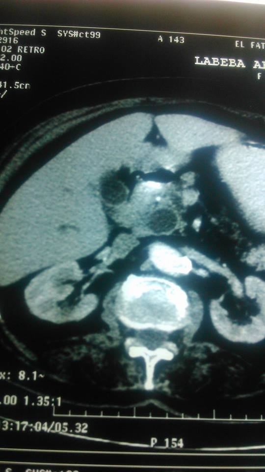 An 80 y old female patient presented with history of progressive jaundice for more than one month. Lab. investigations revealed markedly elevated serum bilirubin, 20 mg/dl mainly direct bilirubin. Abdominal CT scan was done as shown below and ERCP was...
